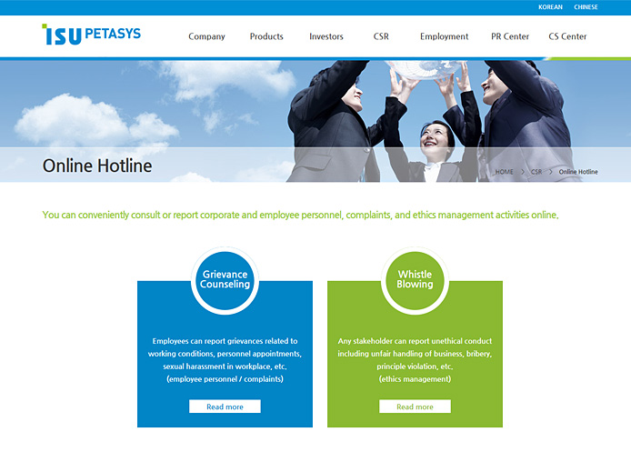 ISU PETASYS has established and operated the employee grievance system. All grievances are addressed by the Employee Grievance Committee appointed according to the grievance regulations in a fair and objective manner. The cyber channel that titled "Online Hotline (grievance counseling)" on the company's website enhanced the accessibility for employees: grievances can be anonymous. Employees are allowed to file their grievances according to categories, including working conditions, personnel management, performance-related grievance, and others, and customers and partners are also encouraged to submit their grievances.