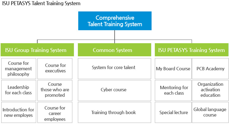 To secure business competitiveness and promote sustainable growth, ISU PETASYS focuses on strengthening employee competency by conducting specialized training on leadership, jobs, and global business practices. Employees of each job group and position are provided with customized training on their jobs: each class is given a sense of duty for their roles; training on leadership is offered as part of the curriculum that helps employees prepare for their future roles; and self-learning culture is created to improve expertise.